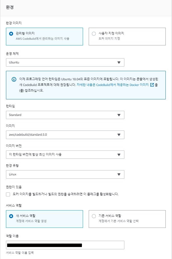 환경 섹션에서는 아래 이미지처럼만 설정해줍니다. 기본적인 설정이며, 각자에 맞는 환경이 필요하다면 상황에 맞게 빌드 환경을 설정하시면 됩니다.