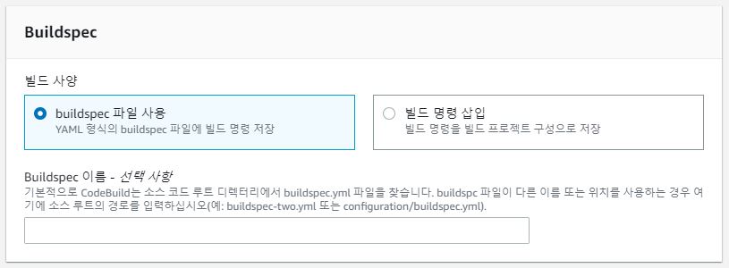 Buildspec 섹션에서는 Buildspec을 어떻게 제공할지 설정하는데, 저는 아까 buildspec.yml을 작성하고 프로젝트 루트 디렉토리에 저장해놨습니다. 그래서 'buildspec 파일 사용'을 선택하고 넘어갑니다.