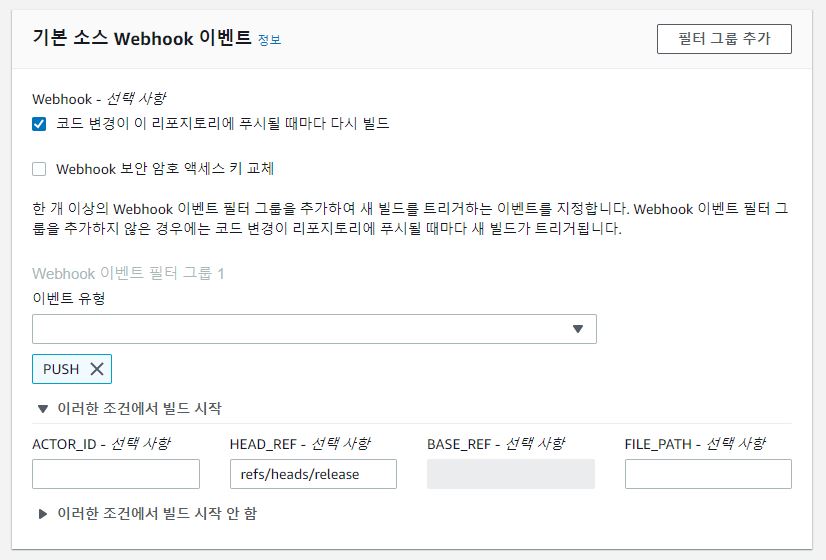 저는 release 브랜치에 PUSH 이벤트가 발생 했을 때 빌드가 실행되게 하기 위해서, '기본 소스 Webhook 이벤트' 섹션에서 이벤트 유형 중에 PUSH를 선택했습니다. 그리고서, '이러한 조건에서 빌드 시작'의 옵션 중에서 'HEAD_REF'에 'refs/heads/release'를 입력했습니다.