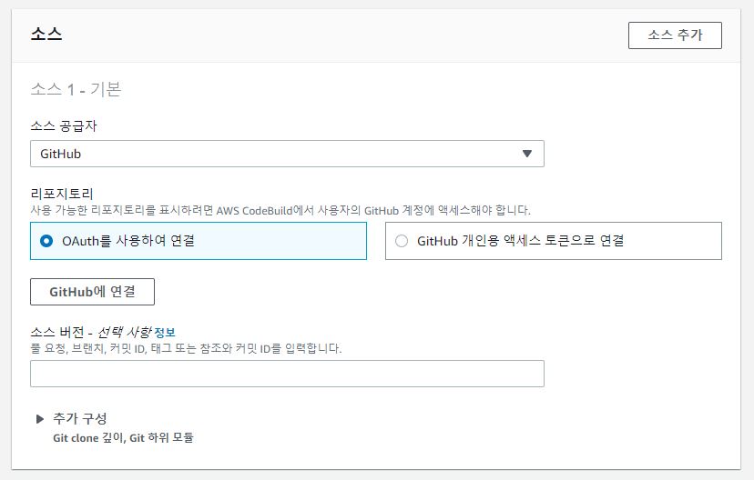 소스 섹션에는 모든 정보를 입력해줍니다. 저는 Github을 소스로 선택하였으며, Github과의 열결을 위하여 OAuth 방식을 사용하였습니다.