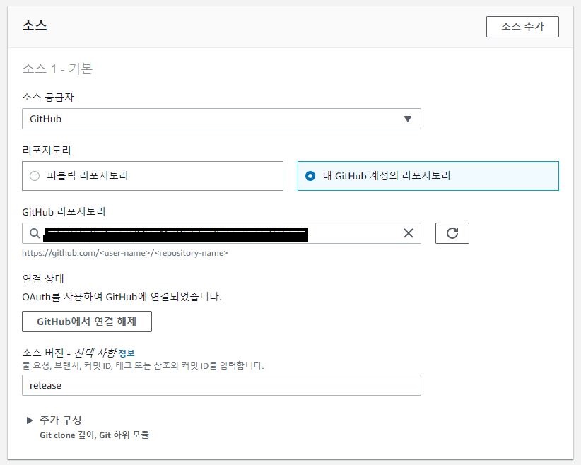 그리고 '소스 버전' 항목에 저는 release를 입력했습니다. '소스 버전'에 입력하는 버전은 CodeBuild console에서 수동으로 빌드할 때 기본으로 사용할 소스의 버전입니다.