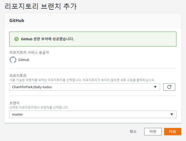 리포지토리 선택 목록에는 제 Github 계정의 Repository들이 나타납니다.