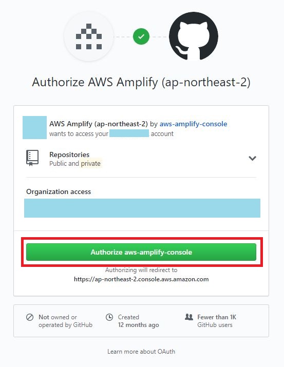 Github을 선택하고 'Continue'를 선택하면 Github 로그인 페이지로 이동할 것입니다. 여기서 로그인을 하면 아래 이미지와 같이 나타나고 'Authorize aws-amplify-console' 버튼을 눌러서 Amplify Console에서 사용자의 Github Repository에 접근할 수 있도록 권한을 줍니다.