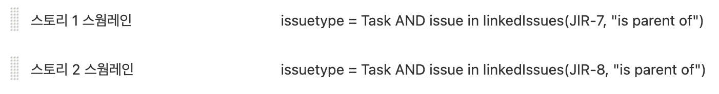 제가 하고 싶은 것은 Story 이슈별로 스웜레인을 만들고, 해당 스웜레인에는 각 Story 이슈와 부모-자식으로 연결되어 있는 Task 이슈들을 보고 싶었습니다.