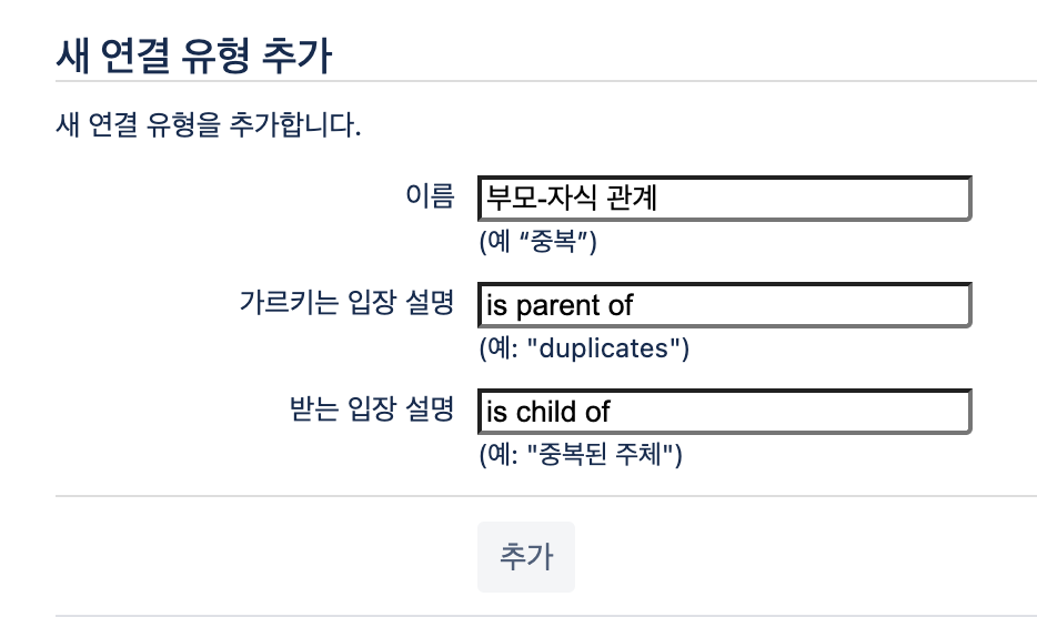 Story 이슈와 Task 이슈를 부모-자식 관계를 갖게 하기 위해서 이슈 Link Type에 아래 2가지를 추가하고 싶었습니다.