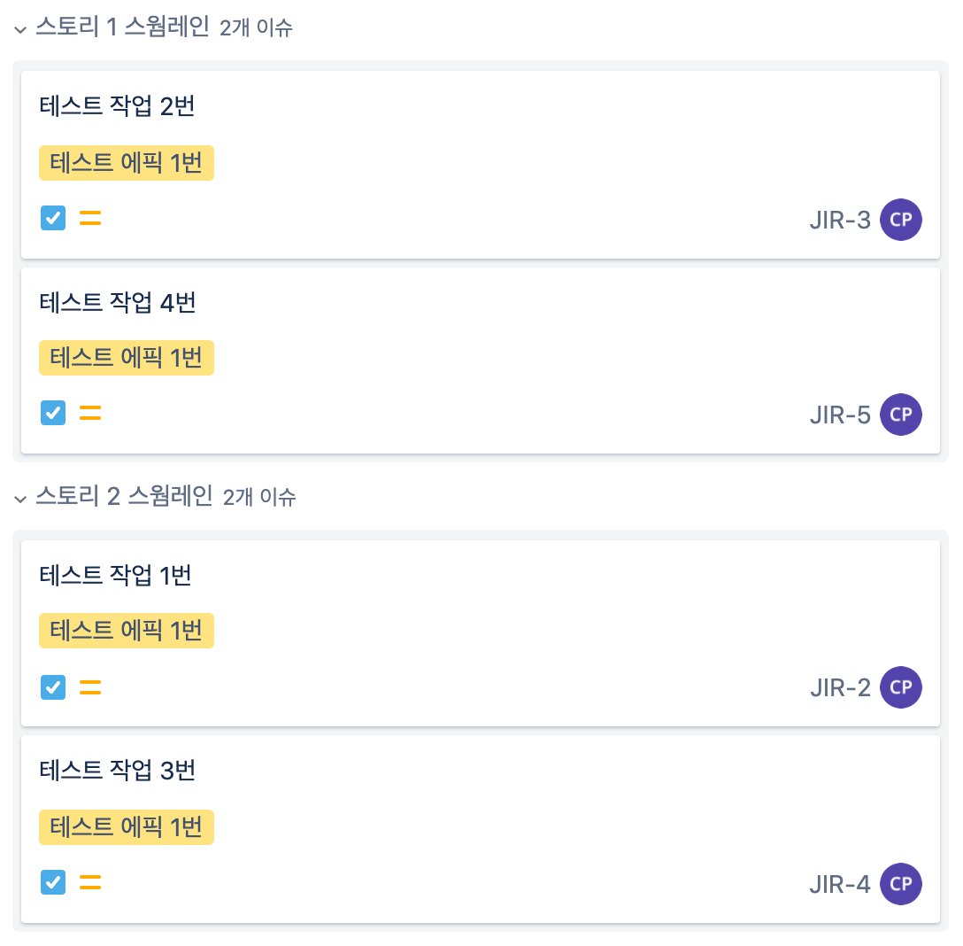 제가 하고 싶은 것은 Story 이슈별로 스웜레인을 만들고, 해당 스웜레인에는 각 Story 이슈와 부모-자식으로 연결되어 있는 Task 이슈들을 보고 싶었습니다.